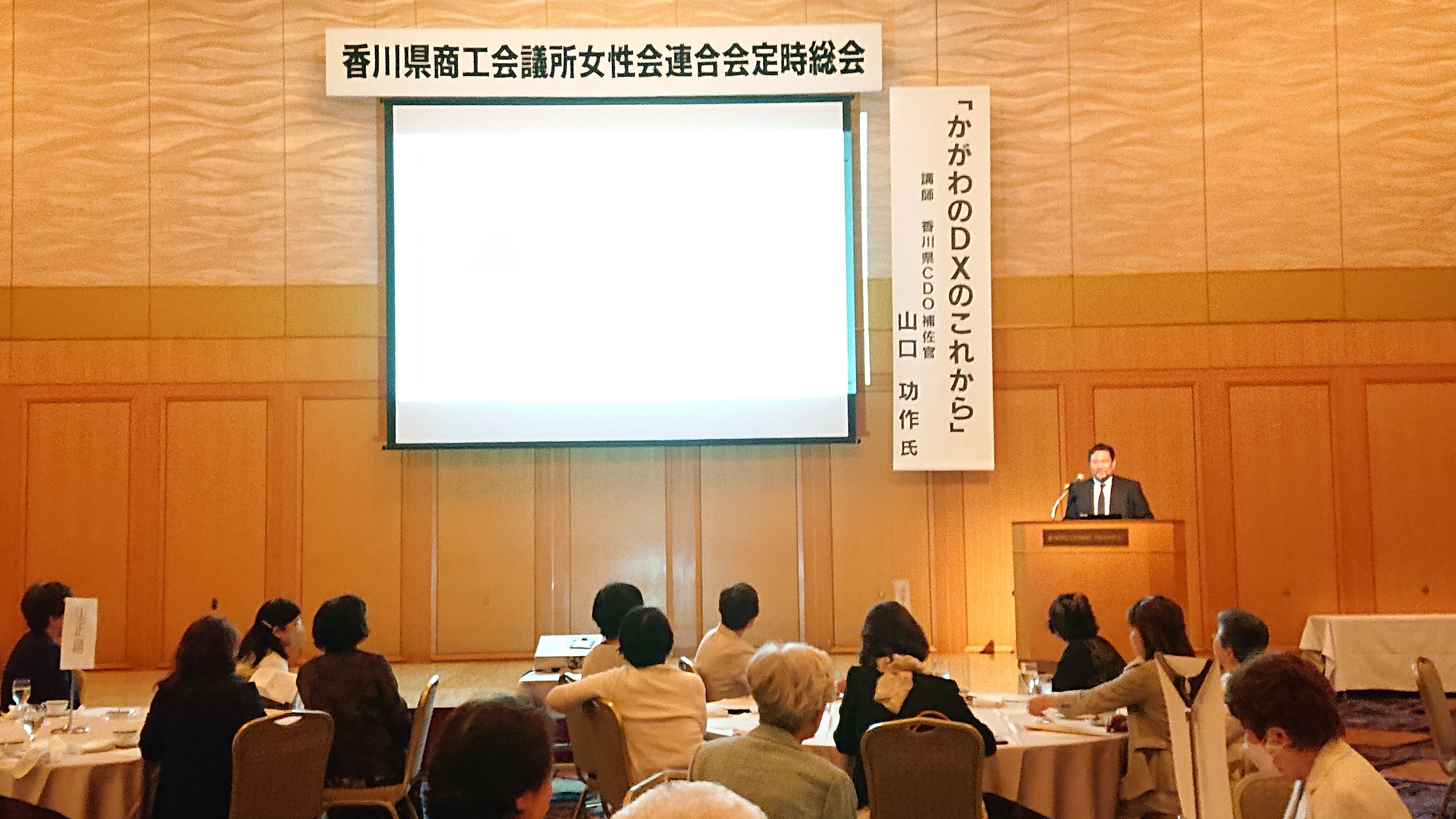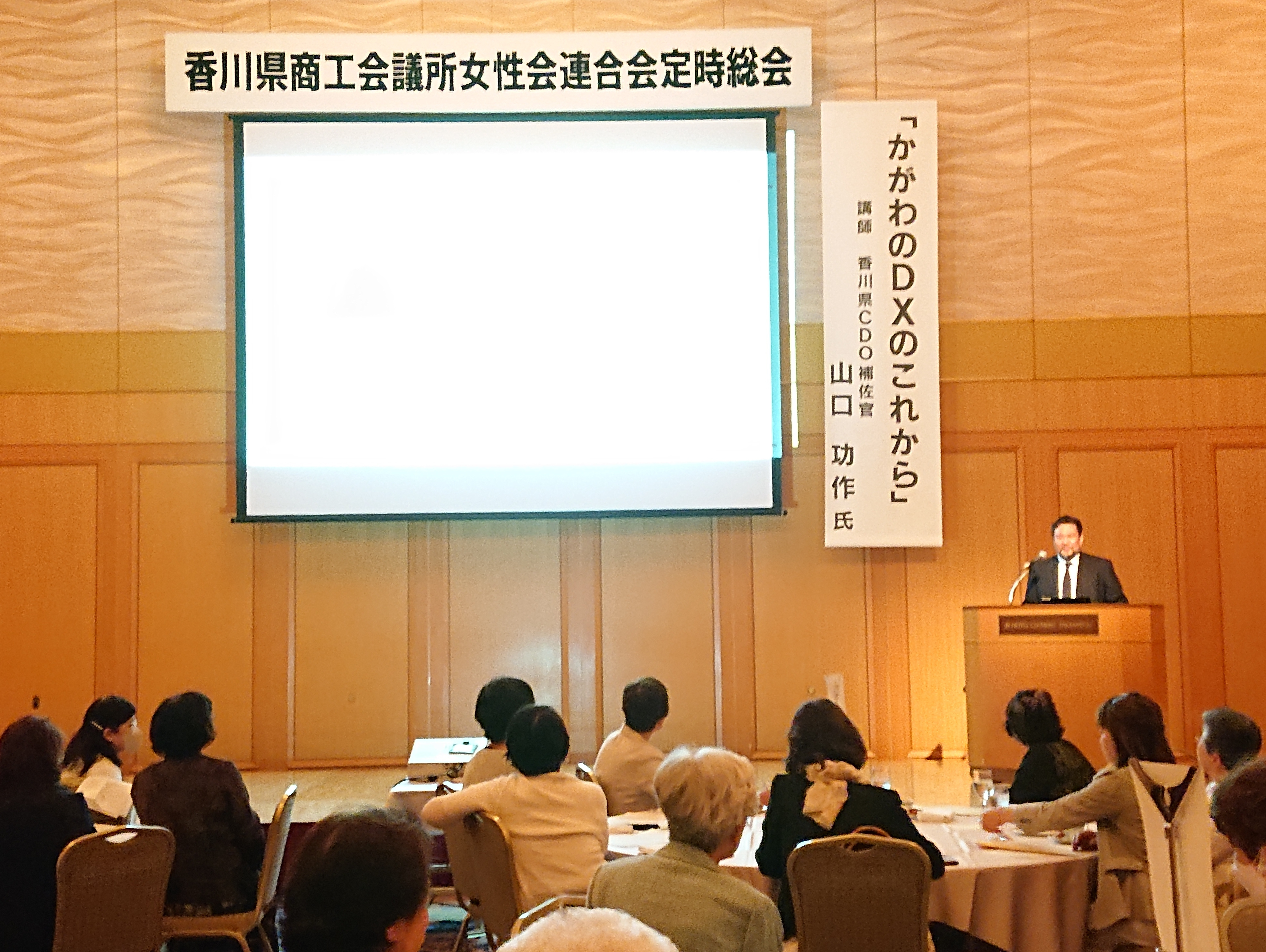 続いて、研修会では「かがわのDXのこれから」と題して、香川県CDO補佐官の山口功作様よりご講演を賜りました。デジタル化を進めるにあたり、セキュリティーや利便性において課題は存在するものの、誰もがDXの恩恵を享受できる未来を目指して県民皆が高い意識を持つことが必要だと感じました。