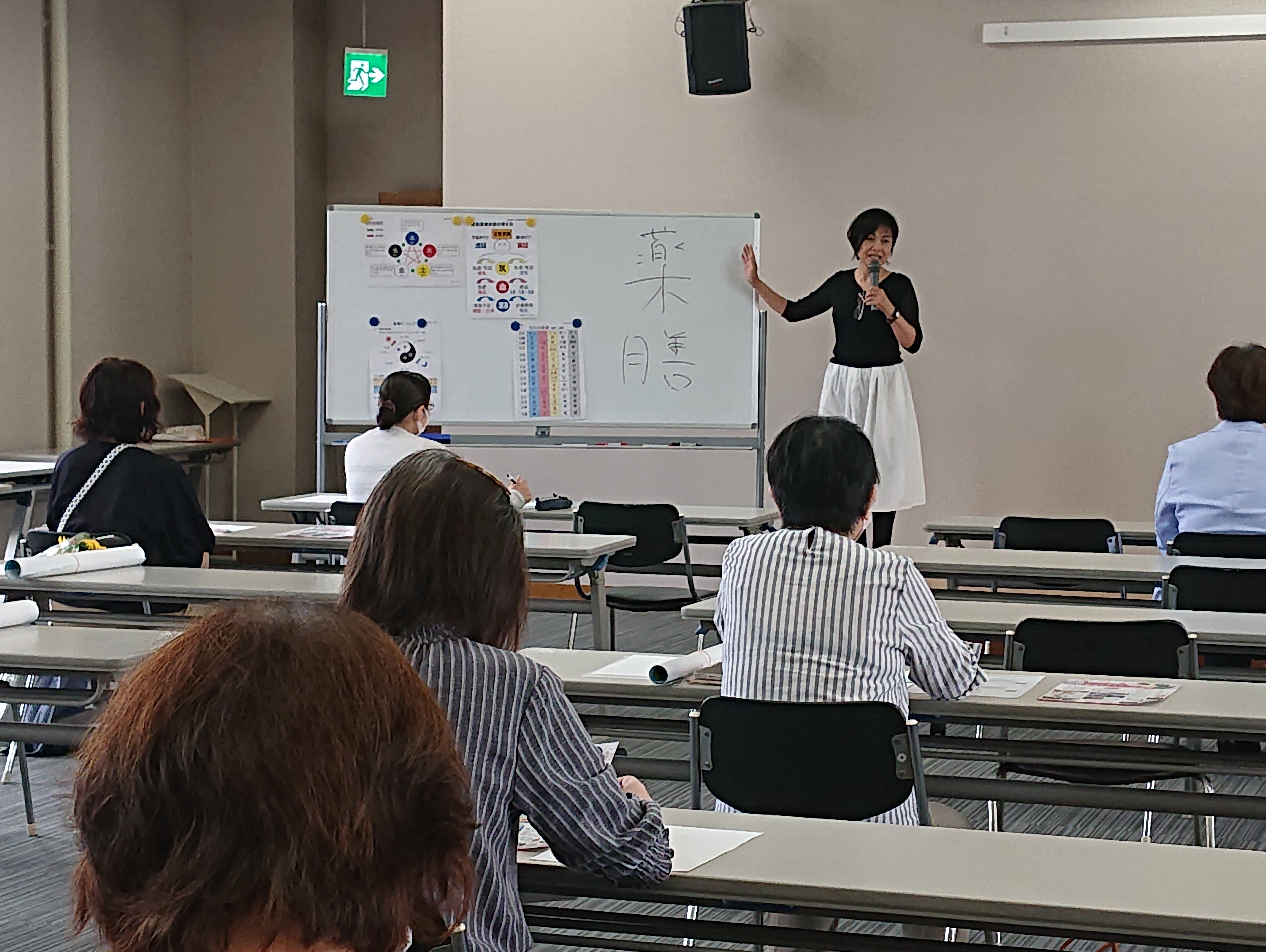 薬膳の目的は、疾病予防、病気の回復など健康維持。人、時、場に合わせ身近な食材を使う美味しい食事と教えていただきました。一時間の講演会終了後も、先生に質問したりお話したりと「薬膳」に皆さん興味が尽きません。