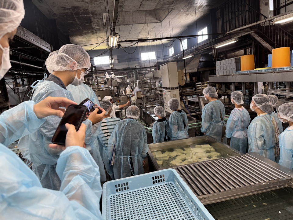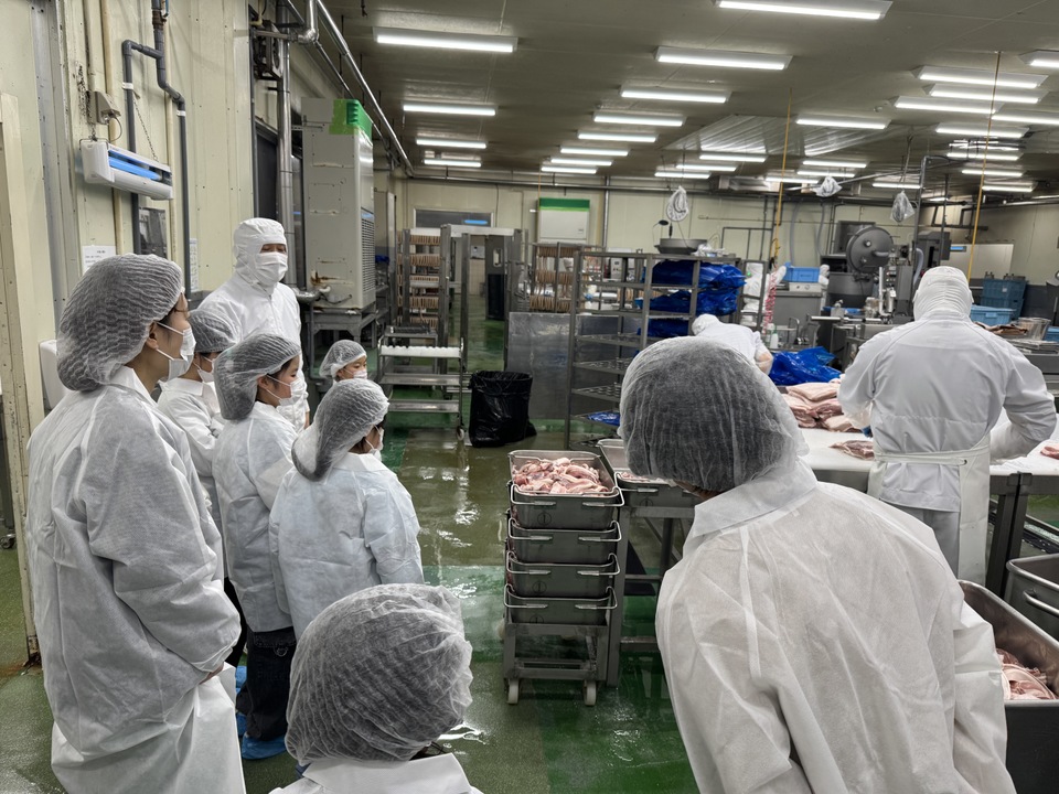 当日は1日をかけて各企業を回りました。午前は「㈱百十四銀行 観音寺支店」で新札の印刷技術等の学びやお札早数え体験などお金の学びから始まり、「四国物産㈱ シコクハム詫間工場」では厳重な衛生チェックの後工場内部でお肉の加工工程を見学。昼食は「さぬき料理 あみ屋」にて地元食材を使った海鮮料理をみんなで味わいました。